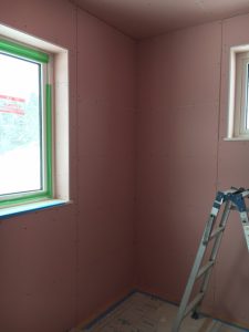 平鹿町醍醐I様邸現場、ハイクリンボード施工中です!(^^)!