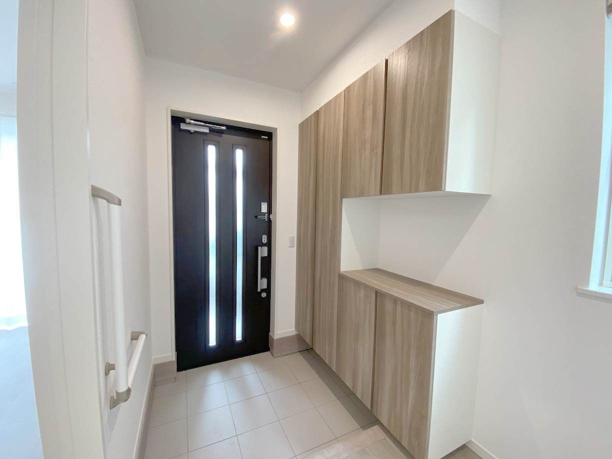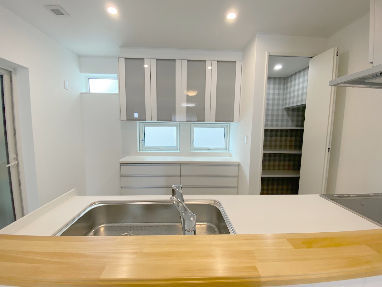 建具もフロアも白とグレージュで統一して優しいお家ができました。収納を開けた時に見えるクロスが素敵です。